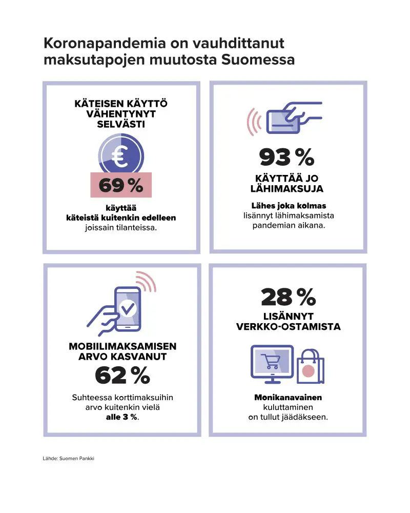 Maksamisen murros on ollut meneillään jo jonkin aikaa. Olemme tottuneet käyttämään digitaalisia rahan muotoja sujuvasti. Koronapandemia vauhditti entisestään siirtymää uusiin maksutapoihin, kun monet kaupat alkoivat vierastaa käteismaksuja siitäkin huolimatta, että tutkimusten mukaan korona ei tartu käteisen välityksellä.